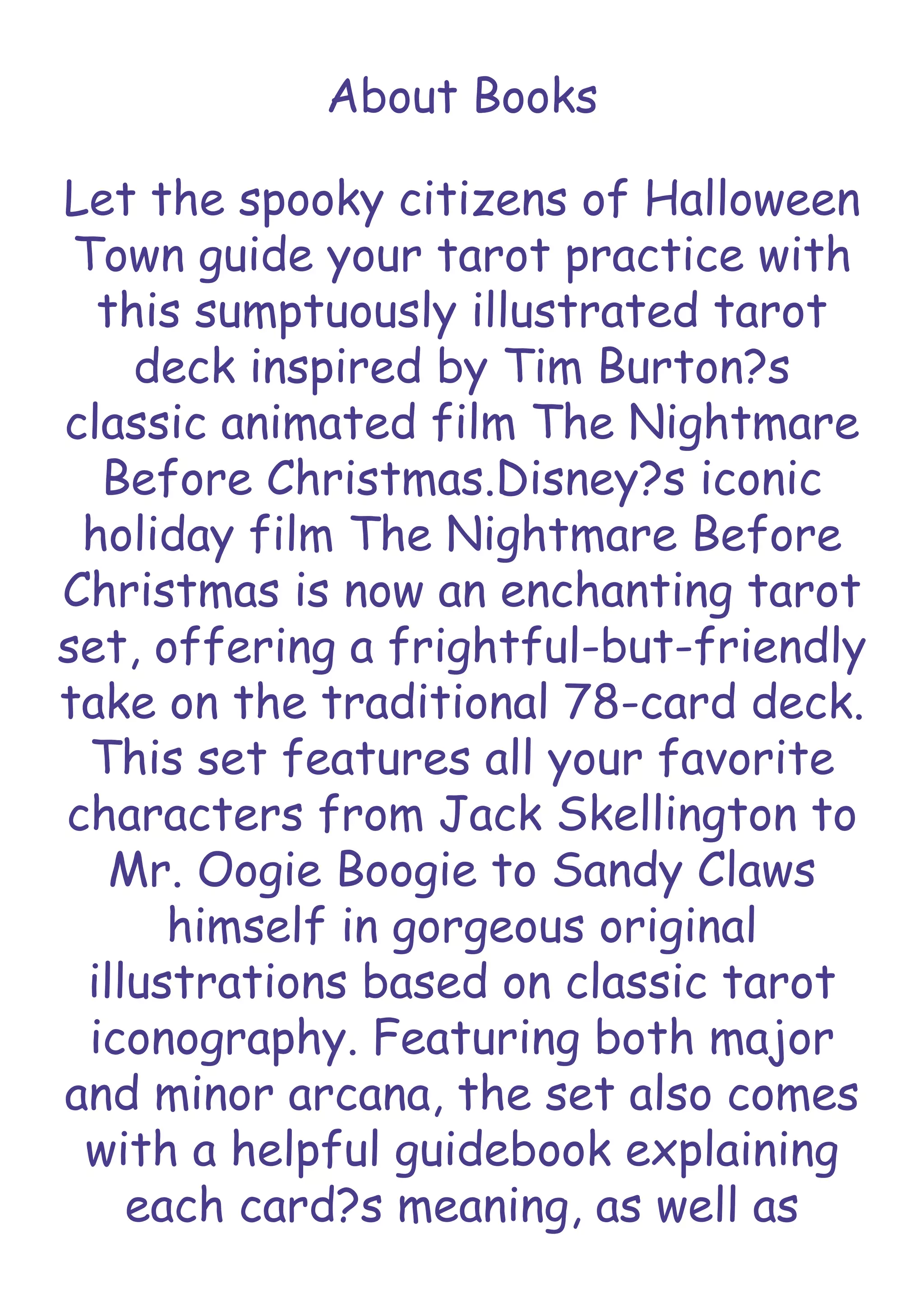 Be the first to write a review. Download Or Read PDF The Nightmare Before Christmas Tarot Deck and Guidebook Free Full Pages Online With Audiobook. Packaged in a sturdy decorative gift box this hauntingly charming tarot deck is the perfect gift for the The Nightmare Before Christmas fan or tarot enthusiast in your life.